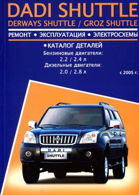 Иллюстрированное справочно-информационное издание Руководство по ремонту Derways Shuttle / Dadi Shuttle / Groz Shuttle, устройство Derways Shuttle / Dadi Shuttle / Groz Shuttle, руководство по эксплуатации и техобслуживанию Derways Shuttle / Dadi Shuttle / Groz Shuttle с 2005 года выпуска, Каталог запчастей Derways Shuttle / Dadi Shuttle / Groz Shuttle, каталог деталей и сборочных единиц Derways Shuttle / Dadi Shuttle / Groz Shuttle, оборудованных бензиновыми двигателями Toyota 491QE и Mitsubishi 4G64S4M рабочим объемом 2,2 и 2,4 л., а также дизелями Peugeot DW10TD, Isuzu 4JB1 / Isuzu 4JB1T литражом 2,0 и 2,8. Ремонт Дервейс Шатл. Эксплуатация. Электросхемы.