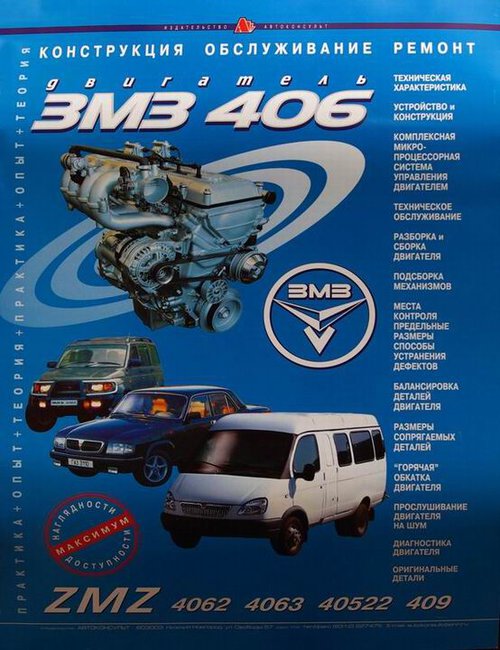 Руководство по ремонту, устройству, техническому обслуживанию и эксплуатации двигателей ЗМЗ 406, 4063, 40522, 409. Пособие выполнено в альбомном варианте.