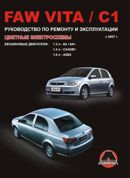Справочно-информационное пособие по ремонту FAW Vita / FAW C1, а также руководство по эксплуатации и техническому обслуживанию, устройство, каталог деталей автомобилей FAW Vita / FAW C1 с 2007 г. выпуска, оборудованных бензиновыми двигателями 8A/8A+ рабочим объемом 1,3 л., CA4GB1 рабочим объемом 1,4 л., 4GB2 рабочим объемом 1,6 л.