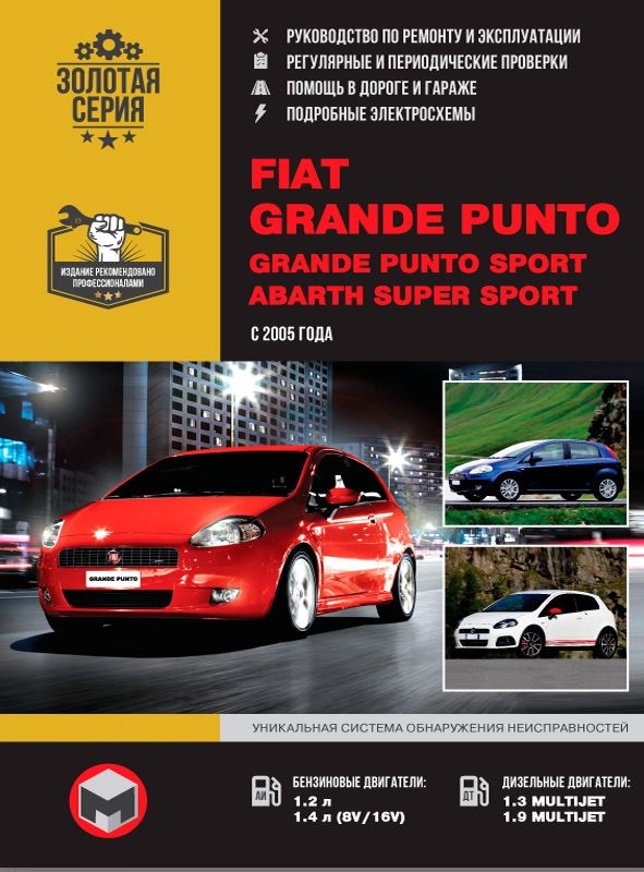 Иллюстрированное справочно-информационное издание Руководство по ремонту Fiat Grande Punto / Fiat Grande Punto Sport / Fiat Abarth Super Sport, а также руководство по эксплуатации и техническому обслуживанию, устройство автомобилей Fiat Grande Punto / Grande Punto Sport / Abarth Super Sport с 2005 года выпуска, оборудованных бензиновыми двигателями рабочим объемом 1,2 8V, 1,4 8V и 1,4 л. 16V, а также дизельными двигателями Multijet рабочим объемом 1,3 и 1,9 л. Ремонт Фиат Пунто. Инструкция по эксплуатации. Рекомендации по ТО. Электросхемы.
