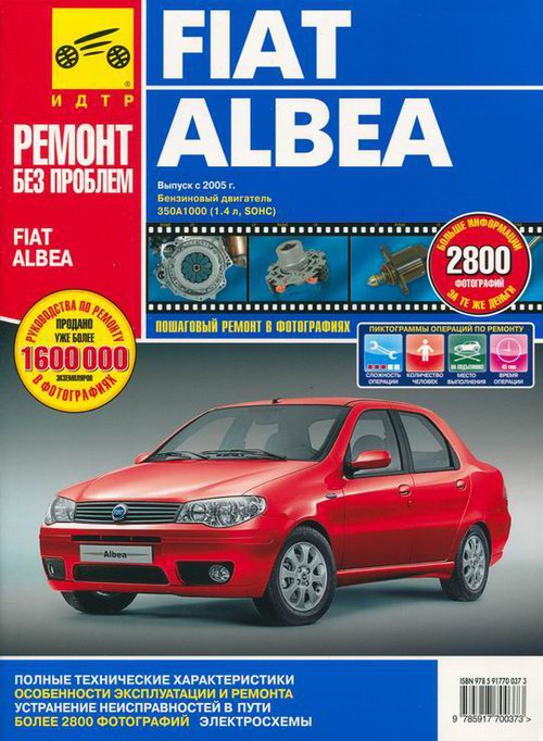 Иллюстрированное в цвете справочно-информационное издание Руководство по ремонту Fiat Albea, а также руководство по эксплуатации и техническому обслуживанию, устройство Fiat Albea с 2005 г. выпуска, оборудованных бензиновыми двигателями 178В2 (350A100), рабочий объем 1,4 л.