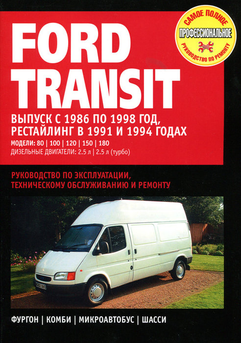 Справочное иллюстрированное издание Пособие по ремонту Форд Транзит, а также устройство, руководство по эксплуатации и техническому обслуживанию Форд Транзит с задним приводом в кузовах микроавтобус, комби, фургон, шасси с двойной и одинарной кабиной, которые выпускались в Бельгии и Турции с 1986 по 1998 годы, включая модели прошедшие рестайлинг в 1991 и 1994 годах, оборудованных 4-х цилиндровыми рядными дизелями с ТНВД или непосредственным впрыском литражом 2,5 и 2,5 с турбонаддувом, оснащенные 5-ти ступенчатой МКП.