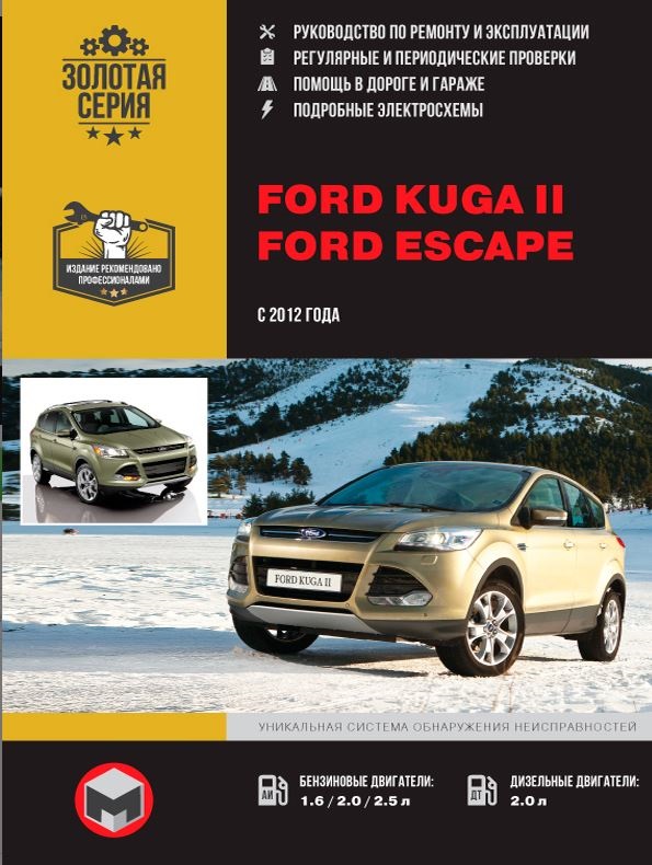 Руководство по ремонту Ford Escape / Ford Kuga II вышло в рамках Золотой серии заслуженно популярного автоиздательства Монолит и, как и прочие мануалы серии, отличается высочайшим уровнем качества представляемого материала, отличной структурированностью и надежностью всех представляемых сведений. Книги этой серии рекомендованы профессионалами как для водителей Форд Ескейп, так и для специалистов, занимающихся обслуживанием и ремонтом этой модели авто.