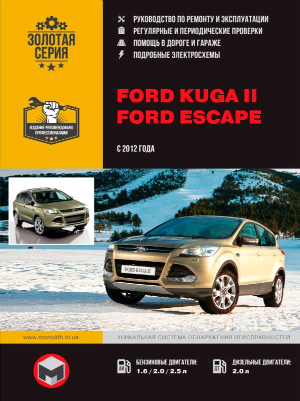 Мануал выпущен в рамках Золотой серии издательства Монолит и, как и прочие мануалы серии, отличается высочайшим уровнем качества представляемого материала, отличной структурированностью и надежностью всех представляемых сведений. Книги этой серии рекомендованы профессионалами как для водителей Форд Куга 2 / Форд Ескейп, так и для специалистов, занимающихся обслуживанием и ремонтом этой модели авто.