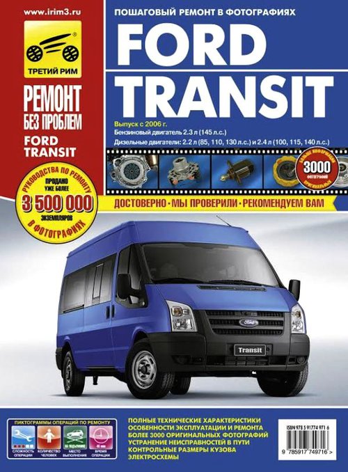 Цветное в фотографиях пособие по ремонту Ford Transit, инструкция по эксплуатации и техническому обслуживанию, устройство Форд Транзит с 2006 года выпуска. Книга рассказывает об автомобилях, оборудованных бензиновыми двигателями объемом 2,3 л. (145 л.с.), дизельными двигателями рабочим объемом 2,2 л. (85,110,130 л.с.) и 2,4 л. (100, 115, 140 л.с.). Ремонт узлов и агрегатов Форд Транзит. Инструкция по эксплуатации. Электросхемы.