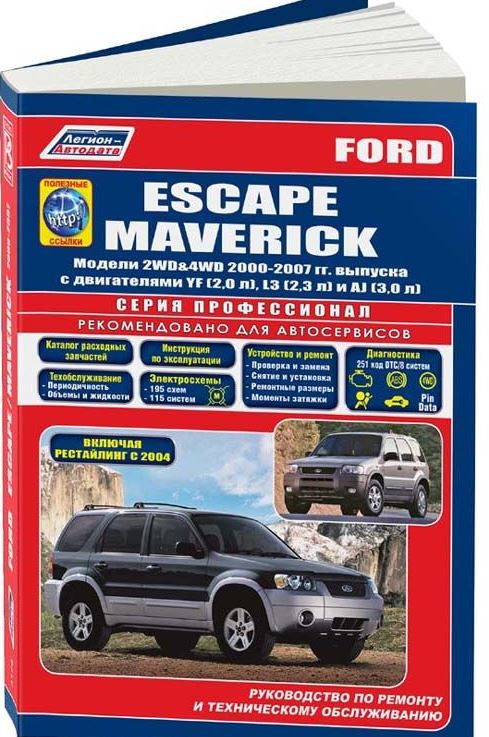 Иллюстрированное подробнейшее пошаговое справочно-информационное издание Руководство по ремонту Форд Эскейп, Форд Маверик, а также инструкция по эксплуатации, техническому обслуживанию и развернутое устройство Форд Эскейп, Форд Маверик с 2000-2007 гг. выпуска, включая рестайлинговый вариант 2004 года в т.ч. с изменениями в трансмиссии. Модели оснащались бензиновыми двигателями YF (2,0 л.), L3 (2,3 л.) и AJ (3,0 л.). Ремонт Ford Escape. Каталог расходных запчастей. Устройство автомобиля. Рекомендации по эксплуатации и ТО. Диагностика. Электрические схемы.