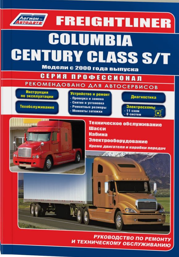 Данное издание посвящено ремонту, устройству и особенностям эксплуатации FREIGHTLINER Century Class S/T (модели с 2000 года выпуска). Вниманию читателя представлена техническая информация, подробно описаны общие характеристики основных систем автомобиля, даны сведения по техническому обслуживанию тягача Фредлайнер Центури (иногда на русском языке его название трансформируют в Сентурию) Класс, а также рекомендации по проведению простейшей диагностики в гаражных условиях, которые позволят владельцу этого грузового автомобиля или его водителю вовремя заметить и распознать тревожные сигналы появления сбоев в работе агрегатов машины.
