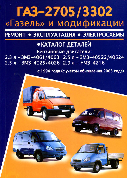 Иллюстрированное справочное издание Инструкция по ремонту ГАЗ 2705-3302 Газель, устройство, руководство по техническому обслуживанию и эксплуатации автомобилей ГАЗ 33021-2705 Газель с 1994 года выпуска и рестайлинговых моделей с 2003 г. выпуска, оборудованных бензиновыми двигателями ЗМЗ-4061 / 4063 (2,3 л.), ЗМЗ-4025 / 4026 (2,5 л.), ЗМЗ-40522 / 40524 (2,5 л., Евро 2), УМЗ-4216 (2,9 л.). Также в сборник включен каталог запчастей ГАЗ 2705-3302 Газель, каталог деталей и сборочных единиц ГАЗ 2705-3302 Газель.