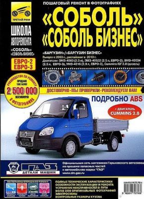 Пособие по ремонту ГАЗ Соболь / Соболь Бизнес / Баргузин / Баргузин Бизнес, а также инструкция по техническому обслуживанию и эксплуатации автомобилей с 2003 года выпуска (рестайлинг 2010), оборудованных бензиновыми двигателями 3M3-4063 (2,3 л), ЗМЗ-40522 (2,5 л, Евро-2), ЗМЗ-40524 (2,5 л, Евро-3), УМЗ-4216 (2,9 л, Евро-3) и дизельными двигателями Cummins ISF 2.8. Ремонт в фотографиях. Цветные электросхемы.