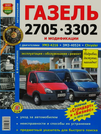 Справочно-информационное иллюстрированное в издание Пособие по ремонту ГАЗ-2705, ГАЗ-3302 (Газель), а также пособие по эксплуатации и техническому обслуживанию, устройство автомобилей Газель (ГАЗ-2705, ГАЗ-3302 и их модификаций), оборудованных двигателями ЗМЗ-40524, УМЗ-4216 и Chrysler, дизельными двигателями Cummins ISF рабочим объемом 2,8 литра.. Рассмотрены также особенности техобслуживания и ремонта самой новой на сегодня модели Газель-Стандарт и Газель-Бизнес (с 2010 г. выпуска), в которых применены импортные узлы и агрегаты с улучшенными показателями и свойствами.
