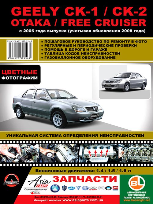 Иллюстрированное в цветных фотографиях пособие по ремонту Geely CK-1 / CK-2 / Otaka / Free Cruiser, инструкция по эксплуатации и техничекому обслуживанию, устройство автомобилей Джили СК-1 / Джили СК-2 / Отака / Фри Круизер, поступивших в продажу с 2005 года, включая рестайлинг 2008 года и оборудованных бензиновыми двигателями MR479Q / MR479QA / MR481QA рабочим объемом 1.4 / 1.5 / 1.6 л.