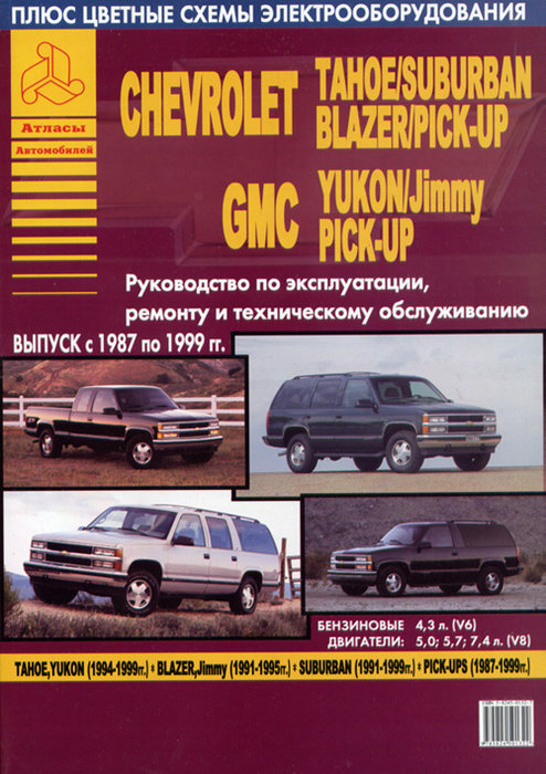 Справочно-информационное издание Руководство по ремонту GMC Jimmy и руководство по эксплуатации и техобслуживанию, устройство Chevrolet Tahoe / Suburban, Blazer / Pick-Up, GMC Yukon / Jimmy / Pick-Up выпуска с 1987 по 1999 гг. с бензиновыми двигателями 4,3 л. (V6), 5,0, 5,7, 7,4 л.(V8).