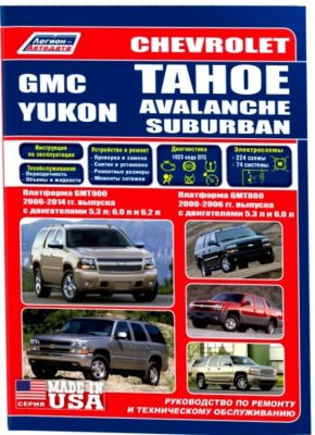 Подробнейшее иллюстрированное информационно-справочное издание Книга по ремонту GMC Yukon, Chevrolet Tahoe / Chevrolet Avalanche / Chevrolet Suburban. Также в мануале рассмотрено устройство, руководство по эксплуатации и процедурам связанным с техническим обслуживанием GMC Yukon, Chevrolet Tahoe / Chevrolet Avalanche / Chevrolet Suburban платформы GMT800, которые производились в период с 2000 по 2006 года и оборудовались бензиновыми двигателями рабочим объемом 5,3 и 6,0 л., а также те же модели, но платформы GMT900 с 2006 по 2014 гг. выпуска, оборудованные бензиновыми движками литражом 5,3, 6,0, 6,2.