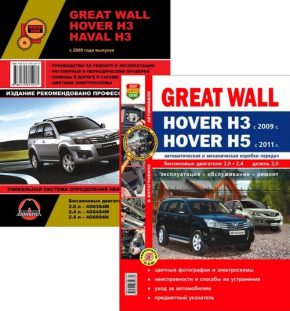 Подробные руководства по ремонту Great Wall Hover H3 / Great Wall Haval H3 / Hover H5 от лучших издательств автолитературы на русском языке – Монолит и Мир автокниг, чьи автопособия прочно занимают ведущие позиции на рынке мануалов по авторемонту, окажутся незаменимыми помощниками при обслуживании, диагностике неполадок и ремонте автомобилей Грейт Вол Ховер Н3 / Н5. В рекомендованных опытными специалистами пособиях владелец автомобиля сможет найти необходимые рекомендации по техническому обслуживанию Great Wall Hover H3, всесторонней диагностике и ремонту автомобиля, правильно «выстроить» уход за Грейт Вол Ховер Н3 / Н5, определиться со временем и частотой проверок транспортного средства.