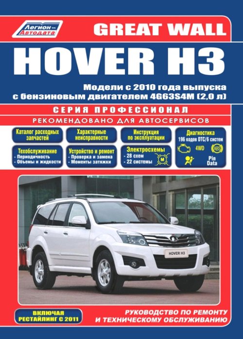 Универсальная практическая инструкция по ремонту Hover H3, включающая руководство по эксплуатации и техническому обслуживанию автомобилей Грейт Вол Ховер Х3 с 2010 года выпуска, оборудованных бензиновыми двигателями 4G63S4M рабочим объемом 2,0 л. Каталог расходных запчастей. Эксплуатация, ТО, устройство. Диагностика неисправностей. Схемы электрических соединений.