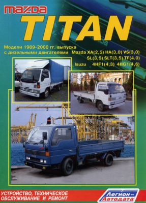 Пособие по ремонту Mazda Titan, устройству и техническому обслуживанию автомобилей Mazda Titan 1989-2000 гг. выпуска, оборудованных дизельными двигателями Mazda XA рабочим объемом 2,5 л., Mazda HA и Mazda VS рабочим объемом 3,0 л., Mazda SL и Mazda SL Turbo рабочим объемом 3,5 л., Mazda TF рабочим объемом 4,0 л., Isuzu 4HF1 рабочим объемом 4,3 л., Isuzu 4HG1 рабочим объемом 4,6 л.