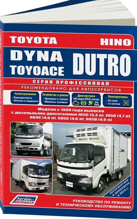 Справочно-информационное, в которое вошли подробные иллюстрации издание Инструкция по ремонту Toyota Dyna / Toyota ToyoAce, Hino Dutro, а также руководство по эксплуатации и процедурам связанным с техобслуживанием, устройство Toyota Dyna / Toyota ToyoAce, Hino Dutro. Модели выпускаются начиная с 1999 года. Автомобили оборудуются дизельными двигателями N04C (4,0 л.), S05C (4,6 л.), J05D (4,7 л.), S05D (4,9 л.), J05C (5,3 л.).