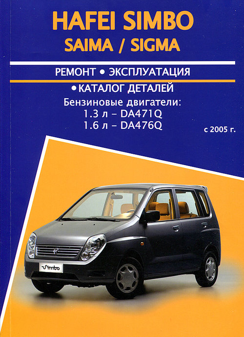 Справочно-информационное иллюстрированное издание Руководство по ремонту Hafei Sigma / Hafei Simbo / Hafei Saima, а также устройство, руководство по эксплуатации и техническому обслуживанию, каталог запчастей Hafei Sigma / Hafei Simbo / Hafei Saima, каталог деталей и сборочных единиц Hafei Sigma / Hafei Simbo / Hafei Saima с 2005 года выпуска, оборудованных бензиновыми двигателями литражом 1,3 и 1,6. Ремонт Хафей Сигма. Эксплутаация. Устройство. ТО. Электросхемы.