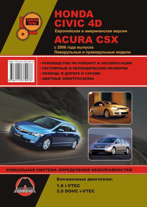 Коллектив издателей автокниги Монолит выпустил по настоящему важный мануал для каждого автовладельца Хонда Сивик 4Д и Акура CSX, задачей которого становится сопровождение хозяина во всех его поездках. Наличие подобных технических мануалов в бардачке машины увеличивает чувство спокойствия, комфорта и уверенности на далеко не самых лучших дорогах отечества. Поэтому многие уже при покупке автомобиля обязательно сразу же обзаводятся такой книгой как эта. И нельзя не сказать о том, сколько денег такой мануал может сохранить для своего владельца, ведь используя брошюру, оказалось, можно многое совершить самому и не звать профессионала, а тем более ехать на профсервис Хонда.