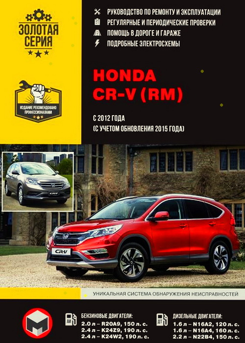 Книга по ремонту Honda CR-V с 2012 года выпуска (включая рестайлинговые модели с 2015 г. выпуска), инструкция по эксплуатации Хонда СР-В, руководство по обслуживанию Honda CR-V оснащенных бензиновыми двигателями R20A9, K24Z9, K24W2 рабочим объемом 2,0, 2,4 литра, дизельными двигателями N16A2, N16A4, N22B4 рабочим объемом 1,6 и 2,2 литра.