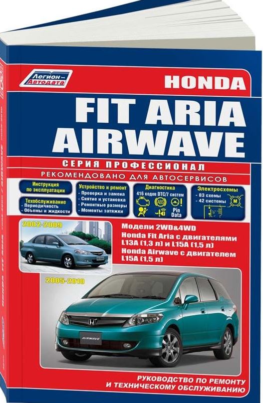 Иллюстрированное информационно-справочное издание Руководство по ремонту Honda Fit Aria, которые выпускались с 2002 по 2009 года. Руководство по ремонту Honda Airwave с 2005 г. выпуска. Также рассмотрено устройство, руководство по эксплуатации и процедурам связанным с техобслуживанием Honda Fit Aria / Honda Airwave. Honda Fit Aria оборудована бензиновыми двигателями 13A и L15A рабочим объемом 1,3 и 1,5 л. соответственно, на Honda Airwave устанавливаются двигатели L15A (1,5 л.). Автомобили с передним и полным приводом. Ремонт Хонда Фит Ария. Устройство, ТО, эксплуатация, диагностика, схемы электрических соединений.