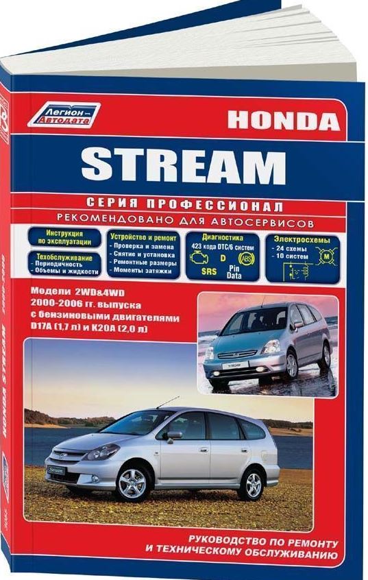 Справочно-информационное издание Руководство по ремонту Honda Stream, а также руководство по техническому обслуживанию и эксплуатации, устройство Honda Stream с 2000 г. выпуска, оборудованных бензиновыми двигателями D17A, K20A рабочим объемом 1,7 и 2,0 л. соответственно. Ремонт Хонда Стрим. Устройство, эксплуатация, ТО, диагностика, электрические схемы.