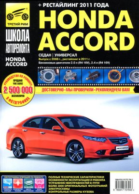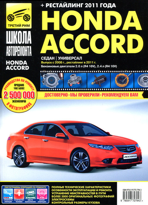 Справочно-информационное, с многочисленными оригинальными иллюстрациями издание руководство по ремонту Хонда Аккорд, а также руководство по эксплуатации и техническому обслуживанию Хонда Аккорд, устройство Хонда Аккорд с 2008 г. выпуска, а также рестайлингового варианта модели с 2011 года. Рассмотрены автомобили в кузовах универсал и седан. Машины оборудованы бензиновыми моторами рабочим объемом 2,0 (R4 16V) и 2,4 л. (R4 16V). Ремонт Хонда Аккорд. Фотографии. Электросхемы.