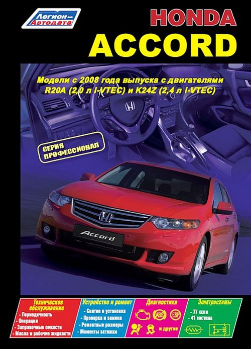 Подробнейшее справочно-информационное, с многочисленными иллюстрациями пособие по ремонту Хонда Аккорд, а также пособие по эксплуатации и техобслуживанию Хонда Аккорд, устройство автомобилей Хонда Аккорд с 2008 г. выпуска. Эта модель Honda Accord оборудована бензиновыми агрегатами R20A (объем 2,0 л. i-VTEC) и К24Z (объем 2,4 л. i-VTEC). Ремонт узлов и агрегатов. Устройство, ТО, эксплуатация, диагностика, электрические схемы.