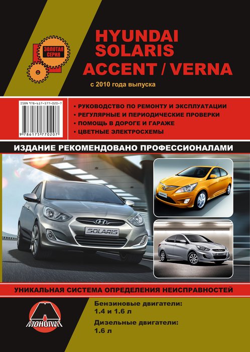 Подробное информационно-справочное пособие с иллюстрациями Инструкция по ремонту Hyundai Accent RB / Hyundai Solaris / Hyundai Verna, а также руководство по эксплуатации и техническому обслуживанию, устройство Hyundai Accent RB / Hyundai Solaris / Hyundai Verna с 2010 года выпуска. Модели оборудуются бензиновыми двигателями рабочим объемом 1,4 и 1,6 л., а также дизельными агрегатами рабочим объемом 1,6 л.