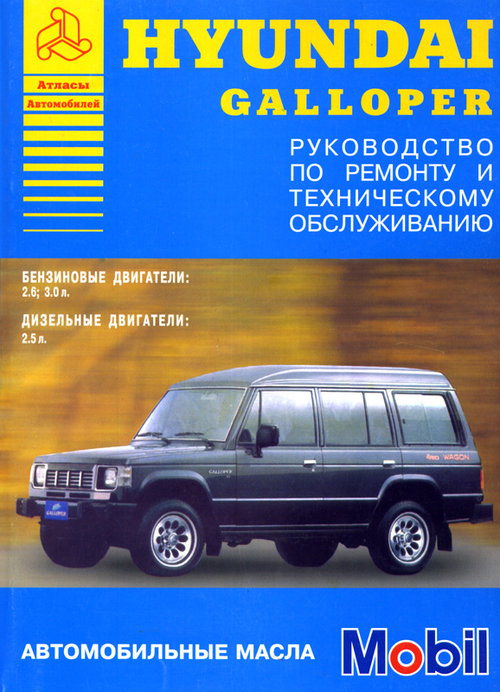 Руководство по ремонту Хендай Галлопер, руководство по техническому обслуживанию и эксплуатации, устройство Hyundai Galloper с 1990 г. выпуска, оборудованных бензиновыми двигателями рабочим объемом 2,6, 3,0 л. и дизельными двигателями рабочим объемом 2,5 л.