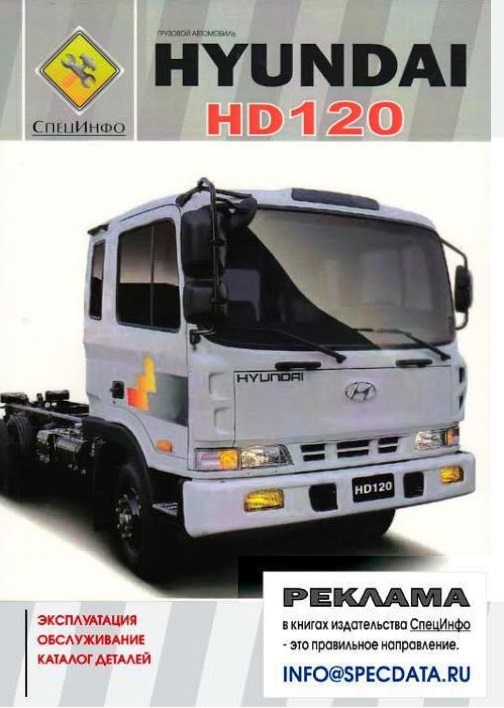 Справочное руководство по эксплуатации Хендай НД120, а также устройство, инструкция по техническому обслуживанию автомобилей Hyundai HD120, оборудованных дизельными двигателями D6BR, D6DA19, трансмиссией M6S6, КН-10, задний мост D4H, D4H-II и D050H. Модификации грузовик и самосвал. Каталог деталей.