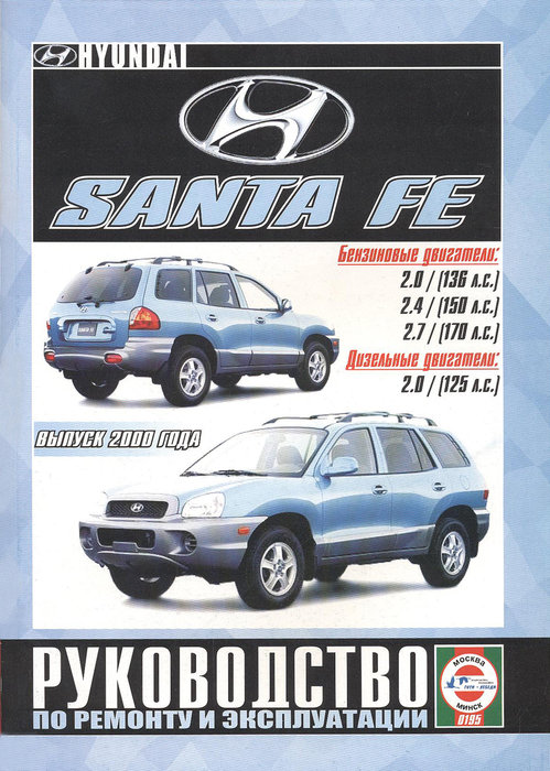 Справочно-информационный мануал пособие по ремонту Hyundai Santa Fe, а также руководство по эксплуатации и техническому обслуживанию, устройство автомобилей Hyundai Santa Fe c 2000 г. выпуска, оборудованных бензиновыми двигателями рабочим объемом 2,0 л. (136 л.с.), 2,4 л. (150 л.с.), 2,7 л. (170 л.с.) и и дизельными силовыми агрегатами литражом 2,0 (125 л.с.).