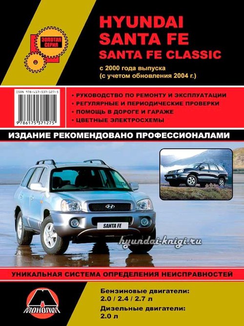 Универсальная книга по ремонту Hyundai Santa Fe / Hyundai Santa Fe Classic, инструкция по эксплуатации и техническому обслуживанию, устройство автомобилей Хендай Санта Фе / Санта Фе Классик с 2000 года выпуска (включая обновления с 2004 года), оборудованных бензиновыми двигателями рабочим объемом 2,0, 2,4, 2,7 л. или дизельными двигателями 2,0 л.