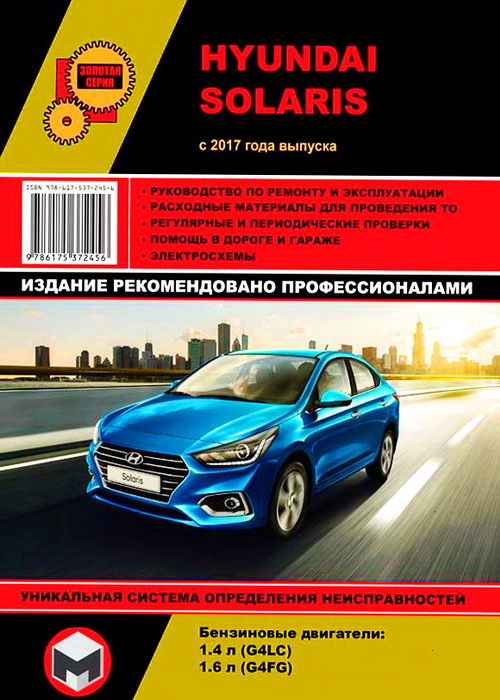Инструкция по ремонту Hyundai Solaris, книга по эксплуатации и обслуживанию Хундай Солярис с 2017 г. выпуска, оснащенных бензиновыми двигателями G4LC рабочим объемом 1,4 литра и G4FG рабочим объемом 1,6 литра.