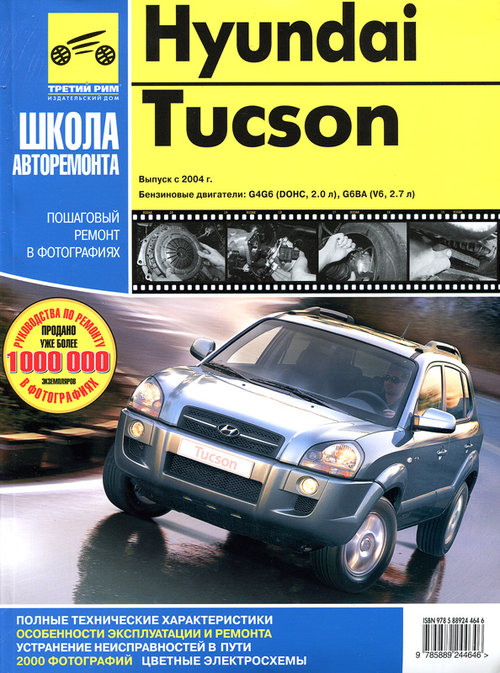 Иллюстрированное информационно-справочное пособие инструкция по ремонту Hyundai Tucson, а также руководство по эксплуатации и техническому обслуживанию Hyundai Tucson, устройство Hyundai Tucson с 2004 г. выпуска, оборудованных бензиновыми силовыми агрегатами G4G6 рабочим объемом 2,0 л. и G6BA рабочим объемом 2,7 л.