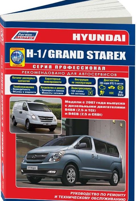 Иллюстрированное справочно-информационное пошаговое издание Руководство по ремонту Hyundai Grand Starex / Hyundai H-1, а также руководство по эксплуатации и техническому обслуживанию, устройство Hyundai Grand Starex / Hyundai H-1. Эти модели производятся начиная с 2007 года и оснащаются дизельными двигателями TCI и CRDI рабочим объемом 2,5 л. каждый. Ремонт Хендай Гранд Старекс. Каталог расходных запчастей. Эксплуатация. Рекомендации по техобслуживанию. Устройство. Диагностика. Схемы электрических соединений.