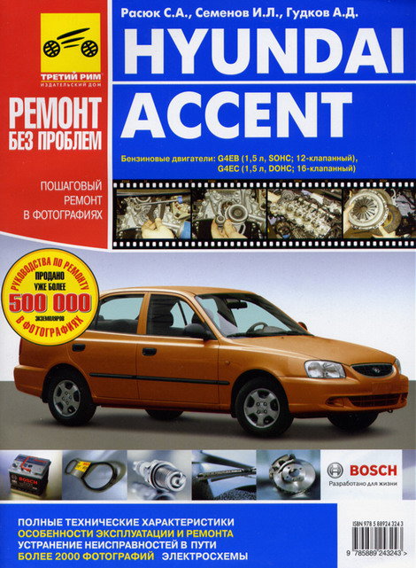 Цветное в фотографиях руководство по ремонту Hyundai Accent, а также руководство по техническому обслуживанию и эксплуатации, устройство автомобилей Hyundai Accent с 2002 г. выпуска, оборудованных бензиновыми двигателями G4EB (1,5 л, SOHC), G4EC (1,5 л, DOHC). Мануал содержит более 2000 цветных фотографий, подробно отображающих весь процесс пошагового ремонта автомобиля.