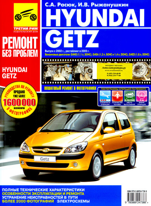 Цветное в фотографиях справочное пособие руководство по ремонту Hyundai Getz, а также руководство по техническому обслуживанию и эксплуатации, устройство автомобилей Hyundai Getz с 2002 г. выпуска и рестайлинговой модели с октября 2005 г. выпуска, оборудованных бензиновыми двигателями G4HD (1,1 л.), G4EA (1,3 л. и 1,4 л.), G4ED (1,6 л.) в кузове 3- и 5-дверный хэтчбек.