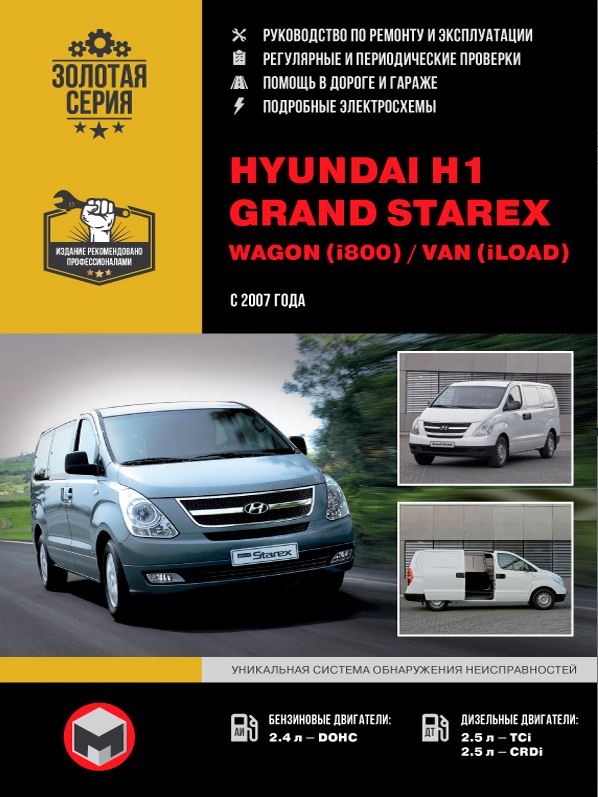Подробнейшее информационно-справочное издание с иллюстрациями Руководство по ремонту Хендай Н1, Хендай Гранд Старекс, а также руководство по эксплуатации и техническому обслуживанию Хендай Н1, Хендай Гранд Старекс, устройство Хендай Н1, Хендай Гранд Старекс c 2007 года выпуска. Эта модель оборудуется бензиновыми двигателями рабочим объемом 2,4 л., а также дизельными агрегатами рабочим объемом 2,5 л. (TCi / CDRi).