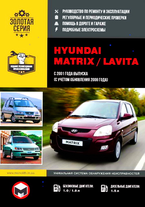 Справочно-информационное иллюстрированное руководство по ремонту Hyundai Lavita / Hyundai Matrix, а также устройство Хендай Лавита, Хендай Матрикс, руководство по техобслуживанию и эксплуатации Хендай Лавита, Хендай Матрикс с 2001 и с 2008 года выпуска. На Hyundai Lavita / Hyundai Matrix установлены бензиновые моторы, рабочий объем которых составляет 1,6, 1,8 л. Также на эти автомобили устанавливался дизель литражом 1,5. Мощность этих двигателей 103 и 122 л.с. Ремонт Хендай Лавита. Инструкция по эксплуатации. Рекомендации по техобслуживаню. Система обнаружения неисправностей. Электросхемы.