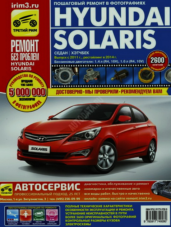 Подробное информационно-справочное со многочисленными цветными иллюстрациями пособие Руководство по ремонту Hyundai Solaris, а также руководство по эксплуатации и техническому обслуживанию Hyundai Solaris, устройство Hyundai Solaris с 2011 г. выпуска, и рестайлинговых моделей с 2014 г. выпуска, оборудованных бензиновыми двигателями R4, 16V рабочим объемом 1,4 и 1,6 л. Ремонт Хендай Солярис. Эксплуатация. ТО. Электрические схемы