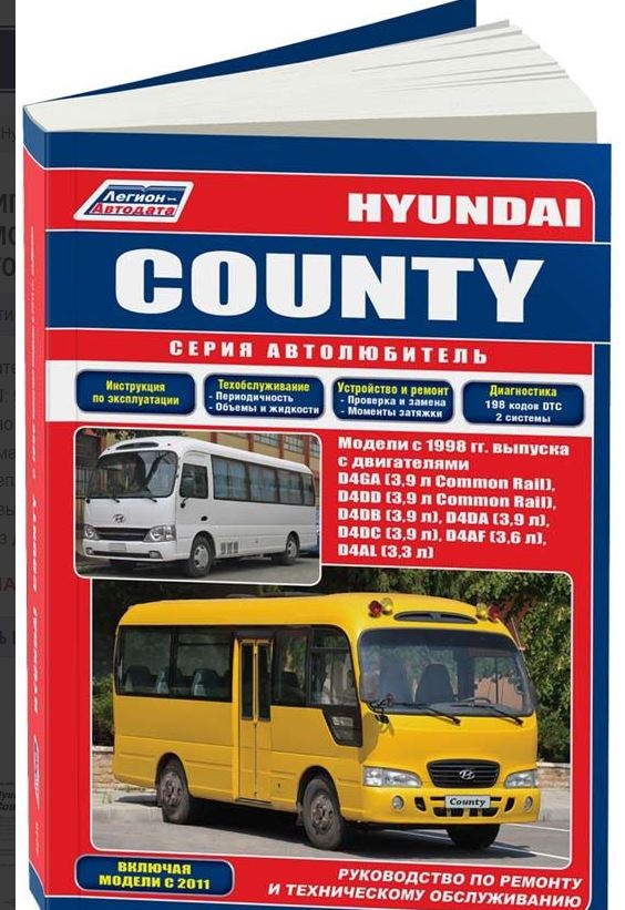 Подробное справочно-информационное иллюстрированное издание руководство по ремонту Hyundai County, руководство по эксплуатации и техническому обслуживанию Hyundai County, устройство Hyundai County с 2004 г. выпуска, оборудованных дизельными двигателями D4AL (3,3 л.), D4AF (3,6 л.), D4DD (3,9 л. Common Rail), D4GA (3,9 л. Common Rail), D4DB, D4DA, D4DС (все объемом 3,9 л.). Ремонт узлов и агрегатов Хендай Каунти. Инструкция по эксплуатации. Рекомендации по ТО. Устройство, диагностика, схемы электрооборудования.