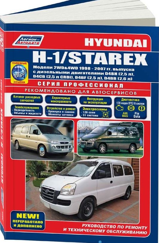 Справочное пособие Руководство по ремонту Хундай H1, техническому обслуживанию и эксплуатации заднеприводных и полноприводных автомобилей Hyundai Н-1 / Starex, оборудованных дизельными двигателями D4BH (2,5 л), D4CB (2,5 л CRDi), D4BF (2,5 л), D4BB (2,6 л). Ремонт Хендай Н-1. Каталог расходных запчастей. Рекомендации по ТО и эксплуатации. Устройство автомобиля. Диагностика неисправностей. Электрические схемы.