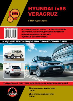 Подробное справочно-информационное, со множеством иллюстраций издание руководство по ремонту Hyundai ix55 / Hyundai Veracruz, а также руководство по эксплуатации и текущему техобслуживанию Hyundai ix55 / Hyundai Veracruz, устройство Hyundai ix55 / Hyundai Veracruz с 2007 г. выпуска. Машина оснащается бензиновыми силовыми агрегатами рабочим объемом 3,8 л. и дизельными моторами рабочим объемом 3,0 л. Мощность двигателей составляет 239 и 260 л.с. Ремонт Хендай 55. Эксплуатация, техобслуживание, устройство, электрические схемы.