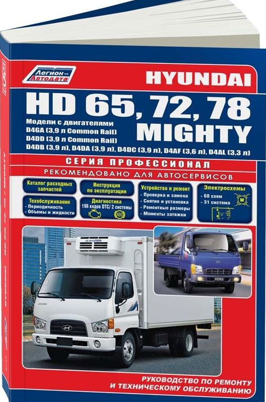 Подробное справочно-информационное иллюстрированное пособие руководство по ремонту Hyundai Mighty, Hyundai HD65, HD72, HD78, устройство Hyundai Mighty, Hyundai HD65, HD72, HD78, руководство по эксплуатации и техническому обслуживанию Hyundai Mighty, Hyundai HD65, HD72, HD78. Эти автомобили оборудуются дизельными силовыми агрегатами D4AL (3,3 л.), D4AF (3,6 л.), D4DD, D4GA (оба 3,9 л. Common Rail), D4DB, D4DA, D4DС (все 3,9 л.). Ремонт Хендай Мигти. Каталог расходных запчастей. Устройство. ТО. Эксплуатация. Электросхемы.