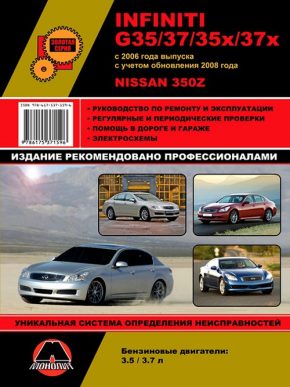 Профессиональное иллюстрированное руководство по ремонту Infiniti G35 / 37 / 35x / 37x, инструкция по эксплуатации и техническому обслуживанию, устройство Инфинити G35/37/35x/37x с 2006 года выпуска (в том числе рестайлинговые модели 2008 года выпуска), оборудованных бензиновыми двигателями рабочим объемом 3,5, 3,7 л. Infiniti G35 и Nissan 350Z построены на основании одной платформы и настоящее издание может использоваться при ремонте обоих автомобилей.