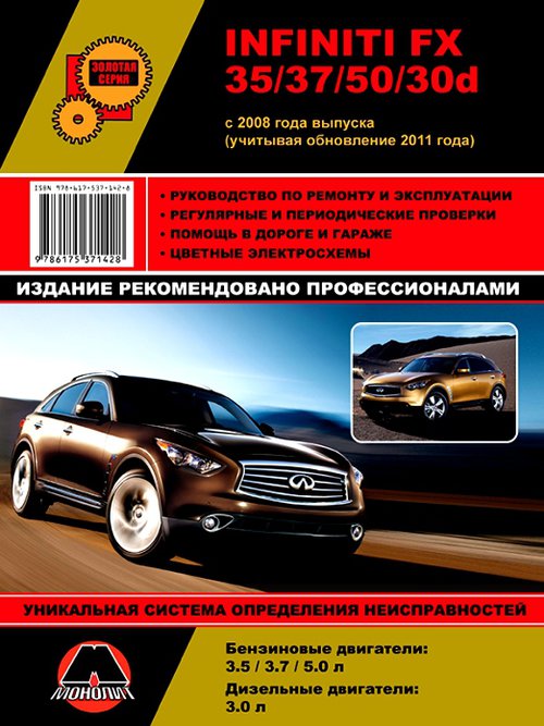 Руководство по ремонту Infiniti FX 35 / 37 / 50 / 30d, инструкция по эксплуатации и техническому обслуживанию, устройство Инфинити ФХ 35 / 37 / 50 / 30д c 2008 года выпуска, включая рестайлинг 2011 года, оборудованных бензиновыми двигателями рабочим объемом 3.5 / 3.7 / 5.0 и дизельными двигателями объемом 3.0D.