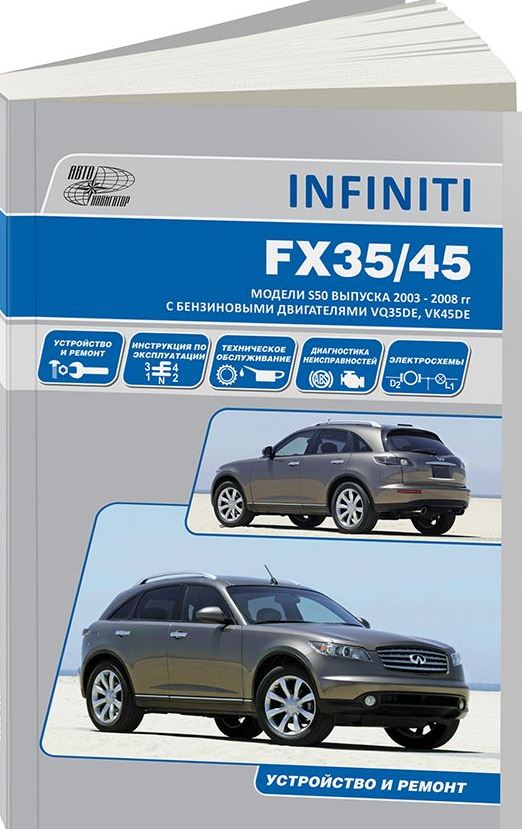 В отдельный раздел издания входят инструкция по эксплуатации Инфинити, в конце руководства помещены электросхемы Infiniti FX35 / Infiniti FX45. Также материалы из пособия помогут потребителю подобрать те запчасти Infiniti FX35 / Infiniti FX45, которые ему необходимы.