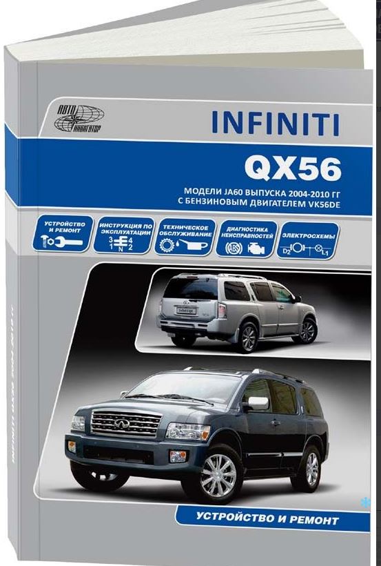 Подробнейшее справочно-информационное издание Руководство по ремонту Infiniti QX56, а также руководство по эксплуатации и техническому обслуживанию, устройство Infiniti QX56 модели JA 60 с 2004 г. выпуска, оборудованных бензиновыми двигателями VK56DE рабочим объемом 5,6 л. Ремонт Инфинити QX56. Устройство автомобиля. Рекомендации по эксплуатации и ТО. Диагностика. Схемы электрических соединений.