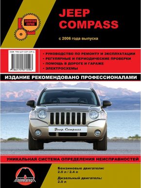 Практическое руководство по ремонту Jeep Compass, а также инструкция по эксплуатации и техническому обслуживанию автомобилей Джип Компасс с 2006 года выпуска, оборудованных бензиновыми двигателями рабочим объемом 2,0 л., 2,4 л. и дизельными двигателями рабочим объемом 2,0 л. Ремонт Джип Компас. Устройство, ТО, эксплуатация. Помощь в дороге и гараже. Электрические схемы.